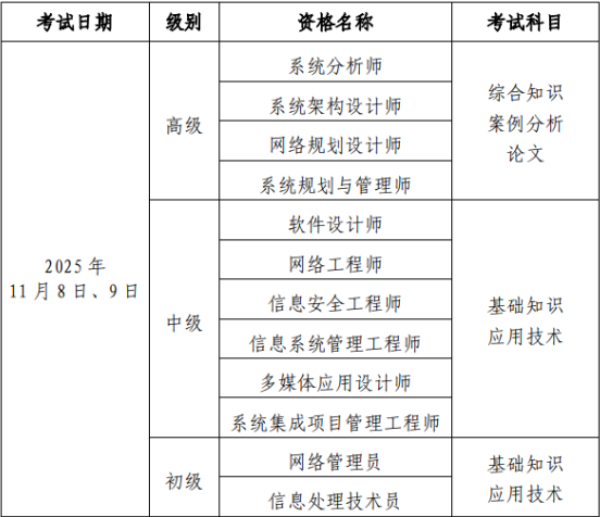 2025年下半年計算機軟件資格考試設置初、中、高三個級別,各級別資格名稱及考試科目見下表: