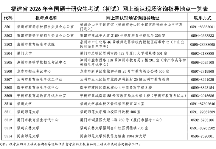 附件:福建省2026年全國碩士研究生考試(初試)網(wǎng)上確認(rèn)現(xiàn)場咨詢指導(dǎo)地點一覽表