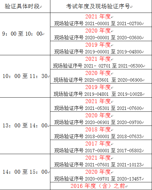 根據國家和本市疫情防控的總體部署和要求,本次驗證時間分四個時段,請務必按照考試年度和現場驗證序號對應的具體時段前往發證現場。具體安排如下: