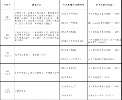專業基礎知識考試采用機試辦法,考試時間60分鐘;基本技能考試辦法如下:A類、B類、E類專業群為機試,考試時間120分鐘,C類專業群為機試和現場操作,考試時間120分鐘;D類專業群為機試和現場面試,考試時間不超120分鐘。