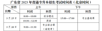(四)普通專升本招生考試時間為2023年3月25日(星期六)至26日(星期日)兩天,具體安排見下表: