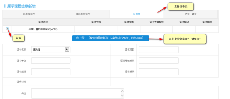 3.在江蘇省參加全國計算機等級考試(NCRE)的考生使用合格證書用于申請免考的,須按以下流程進行“一鍵免考”:請直接選擇證書類→勾選出現的信息(如未出現可勾選的信息,須自行核對NCRE證書信息中的身份證號碼及姓名是否與本系統中的信息相符)→勾選后點擊藍色按鈕(如圖1)→直接得到免考審核結果。